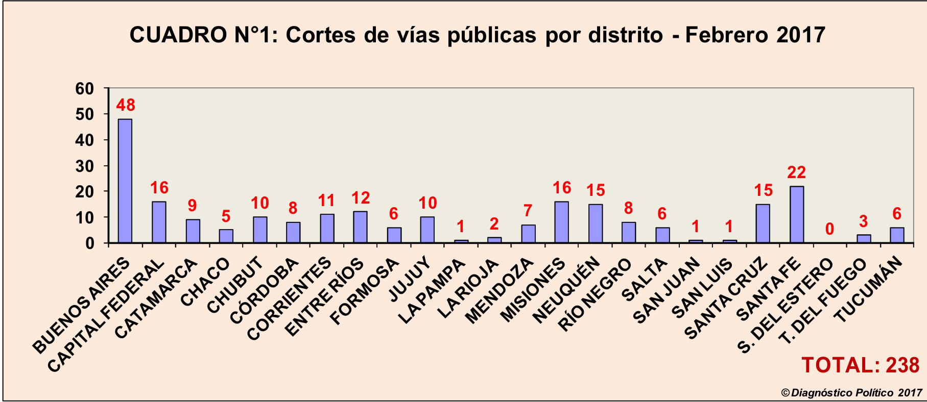 Durante el mes de febrero se registraron 238 piquetes en todo el país, lo que significó un aumento del 20% respecto al mes anterior. El dato alentador es que, con relación a febrero de 2016, los bloqueos tuvieron una profunda caída del 115%. No obstante, es esperable que de cara a un mes de marzo que se anticipa muy conflictivo, los bloqueos experimenten una importante escalada.