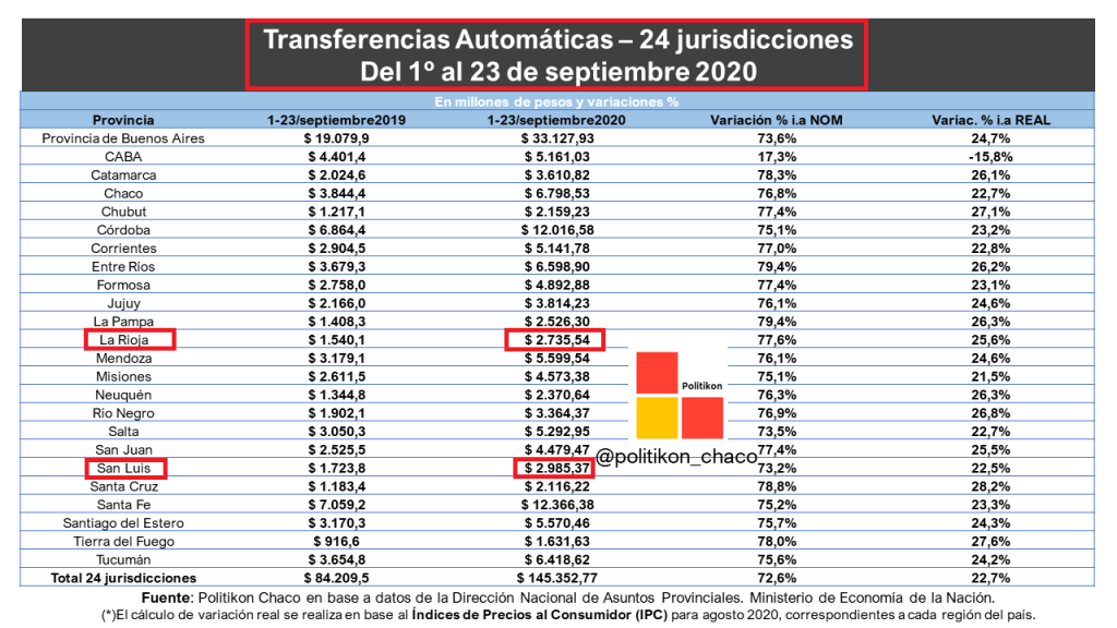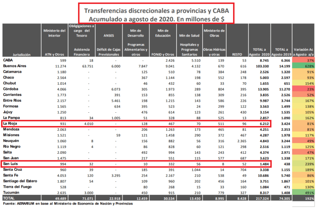 Transferencias discrecionales hasta agosto: La Rioja $6.212 millones; San Luis $1.484 millones