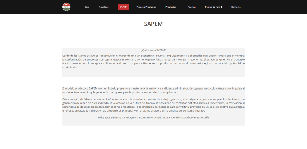 Según la página web, Cerdo de los Llanos SAPEM se constituye en el marco de un Plan Económico Provincial impulsado por el ex gobernador Luis Beder Herrera que contempla la conformación de empresas con capital estatal mayoritario con el objetivo fundamental de movilizar la economía.