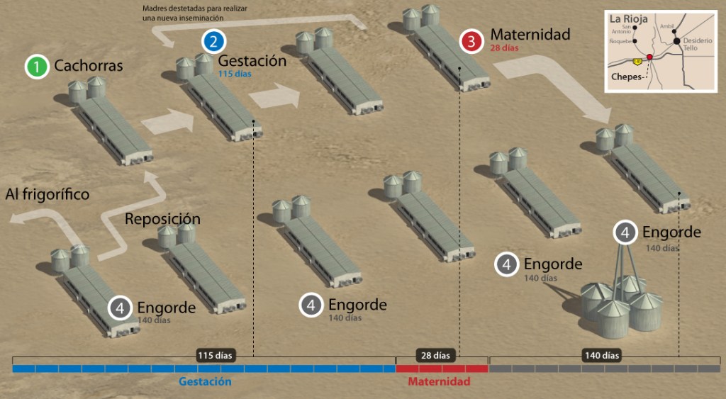 Según su página web, Cerdo de los Llanos SAPEM -una de las mayores apuestas productivas del Estado de la Provincia de La Rioja- apunta a desarrollar todos los eslabones de la cadena de producción porcina (Reproducción, cría, engorde y comercialización) en una escala que permitió incidir y modificar la matriz productiva de la provincia y especialmente de la zona de los llanos.