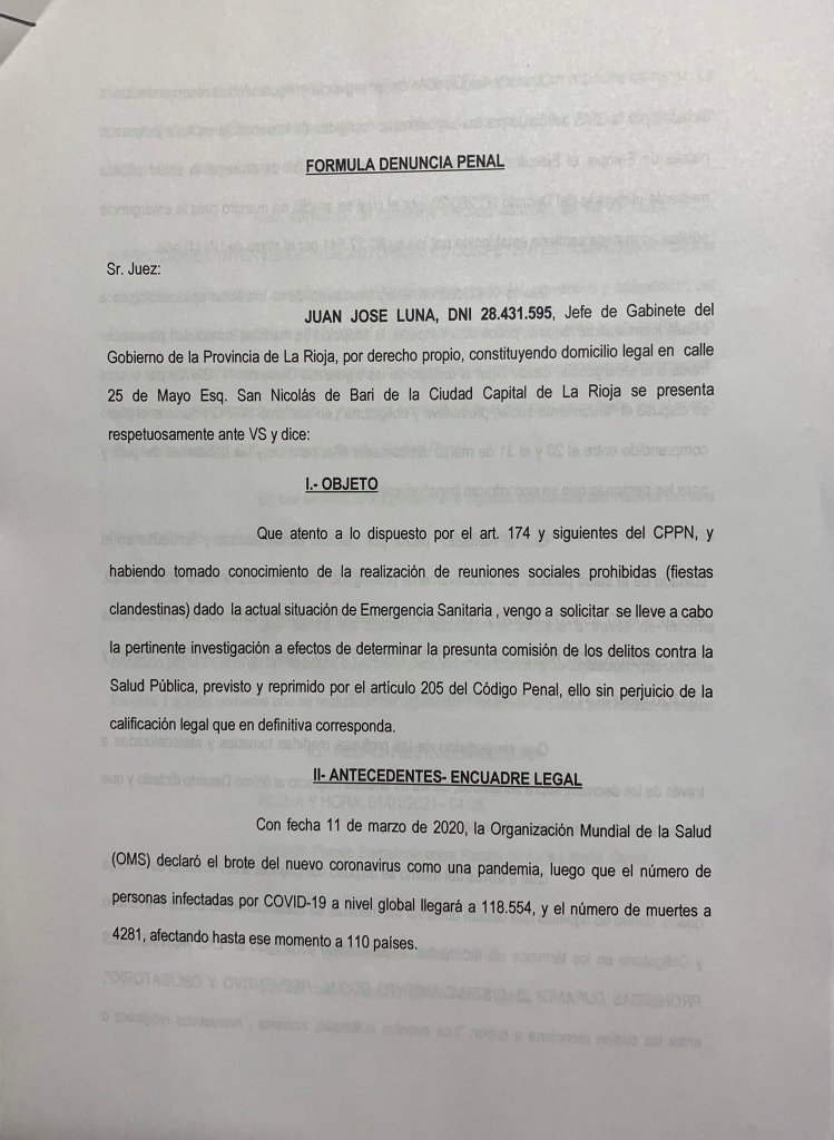 A través de su cuenta en Twitter, Luna Corzo informó que «hoy presenté en mi carácter de Jefe de Gabinete denuncia penal ante la Justicia Federal de 10 reuniones sociales no autorizadas en el contexto de la pandemia (fiestas clandestinas) en las que intervino la Policía entre el 1 y 3 de enero».