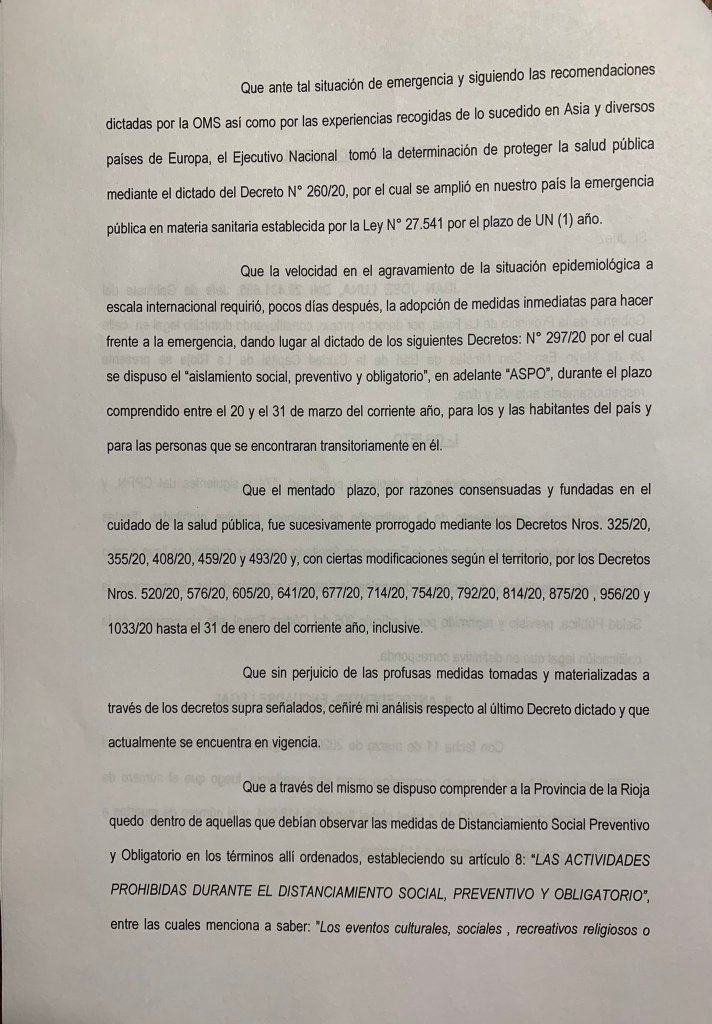 En ese sentido, explicó que «estas reuniones sociales fueron atentados contra la salud pública. Por ello constituirían hechos que violan la medidas adoptadas para impedir la propagación de la COVID-19 lo que está penado con 6 meses a 2 años de prisión (Art. 205 del Código Penal)».