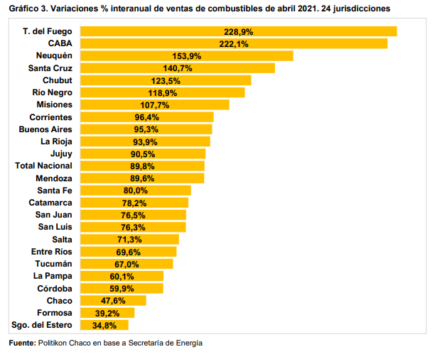 La media nacional se incrementó en un 89,8%, y fueron once los distritos con alzas mayores a ese nivel. Tierra del Fuego y CABA encabezan esta suba con alzas superiores al 200%: en estas, la movilidad creció considerablemente y eso disparó las ventas y, además, no debe dejar de considerar las caídas históricas que sufrieron estas dos jurisdicciones en abril 2020 (-71,6% y -72,2%, respectivamente), lo cual hace más fuerte el rebote. Por su parte, otras cinco provincias, crecieron por encima del 100%.