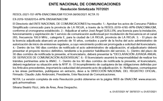 2 – Adjudicar a la firma GRUPO PROVINCIA S.A., integrada por el señor Gustavo David LUNA, con un 85% de participación en la formación de la voluntad social y el señor Maximiliano Ezequiel MOSCA, con un 15% de participación en la formación de la voluntad social, una licencia para la instalación, funcionamiento y explotación de 1 servicio de comunicación audiovisual por modulación de frecuencia en el canal 293, frecuencia 106.5 MHz., categoría E, para la ciudad de LA RIOJA, pcia. de LA RIOJA.