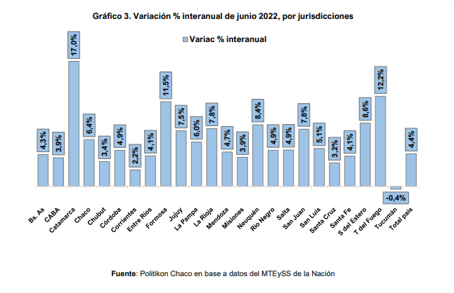 En este marco, Catamarca continúa ocupando la posición de líder nacional de subas relativas del empleo privado formal, tras un incremento registrado en junio del 17,0%; en segundo lugar, quedó Tierra del Fuego (+12,2%) y Formosa completa el podio (+11,5%), siendo estas las únicas tres jurisdicciones con alzas de doble dígito.