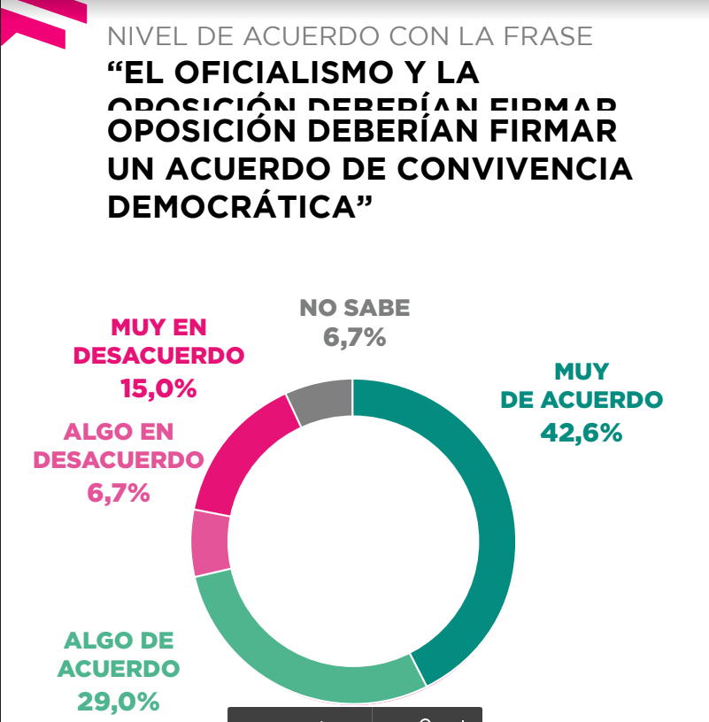 Luego de una consideraciones generales, el informe observa que “un 71% dice que tanto el oficialismo como la oposición deberían moderarse luego del atentado (contra Cristina Fernández). Un porcentaje prácticamente idéntico afirma que se debería firmar un acuerdo de convivencia democrática. La polarización, aunque exacerbada y agresiva, no elimina el carácter democrático de la sociedad argentina..