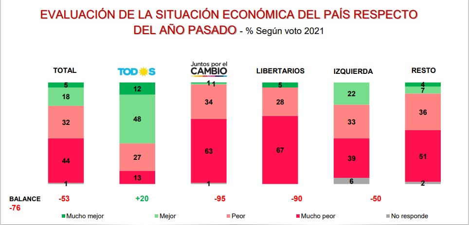 La mayoría de los encuestados mantiene el panorama negativo de la evaluación económica actual del país; al tiempo que entre los votantes del Frente de Todos aumenta cinco puntos (60%) la visión que la situación es mucho mejor o mejor que el mes anterior (55%), pero disminuye también en cinco puntos la visión optimista sobre el futuro (de 76% a 71%).