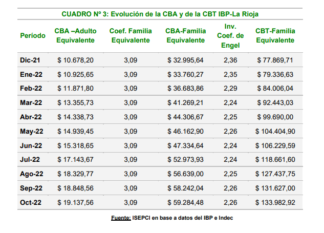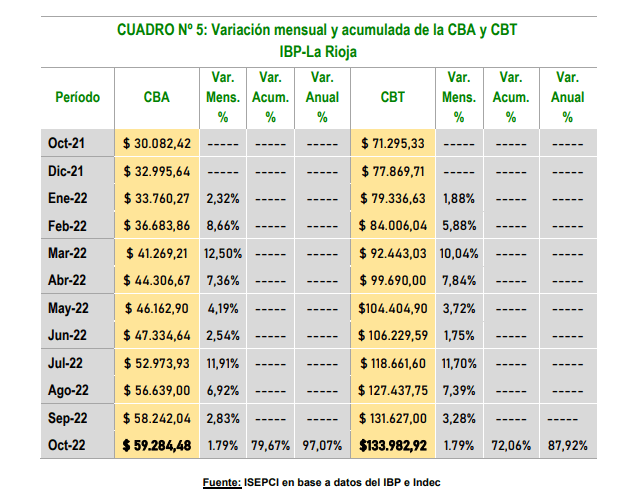 La Canasta Básica Total (CBT) del IBP- La Rioja para Octubre de 2022 es de $133.982,92 para una familia tipo. Se trata de la canasta para no ser pobre.