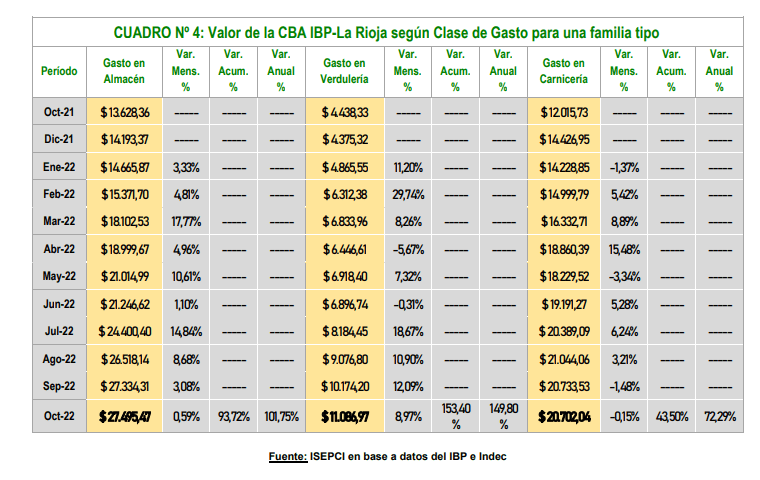 El tradicional Índice Barrial de Precios, que realiza el Instituto de Investigación Social, Económica y Política Ciudadana, estableció la medición de la Canasta Básica Alimentaria (CBA) del IBP-La Rioja para el mes de octubre de 2022 que presenta un valor de $ 59.284,48 para una familia tipo. Se trata de la canasta para no ser indigente.