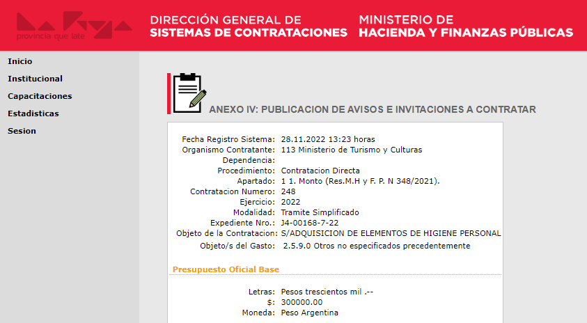 La Dirección General de Sistemas de Contrataciones, dependiente del Ministerio de Hacienda y Finanzas Públicas, informó que el Ministerio de Turismo y Culturas compró copas menstruales por $697.628,40, según el expediente J4-00166-5-22.