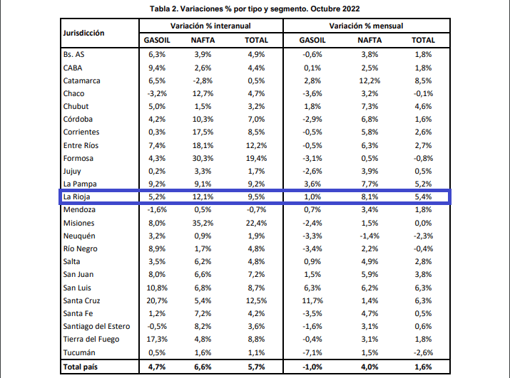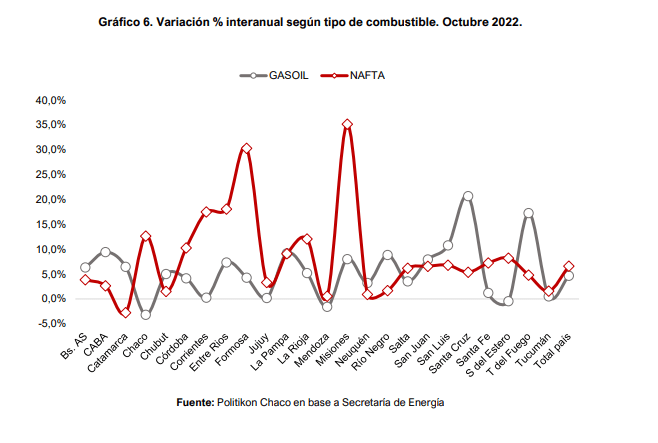 En ese marco, la provincia con la mayor suba en naftas fue Misiones (35,2%) seguida por Formosa (30,3%) y Entre Ríos (18,1%);