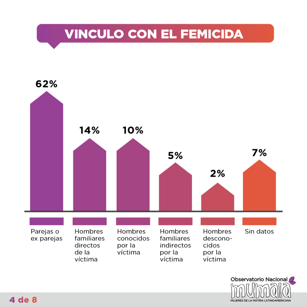 65 % de los femicidios fueron cometidos en la vivienda de la víctima o en la vivienda compartida. 6% de los femicidios fue cometido por personas de las fuerzas de seguridad.