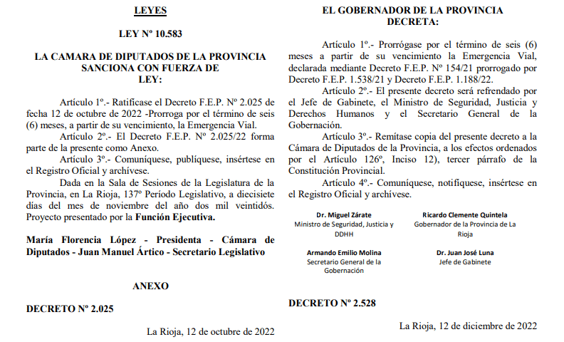 Artículo 1º.- Prorrógase por el término de seis (6) meses a partir de su vencimiento la Emergencia Vial, declarada mediante Decreto F.E.P. Nº 154/21 prorrogado por Decreto F.E.P. 1.538/21 y Decreto F.E.P. 1.188/22.