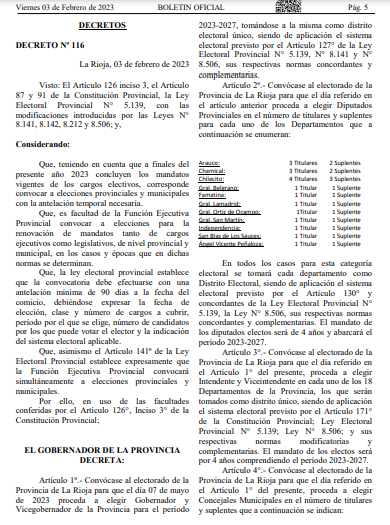 A través del Boletín Oficial del viernes 3 de febrero se publicó el decreto 116 del 3 de febrero donde el gobernador Ricardo Quintela convoca a elecciones para todos los cargos provinciales y departamentales para el 7 de mayo.