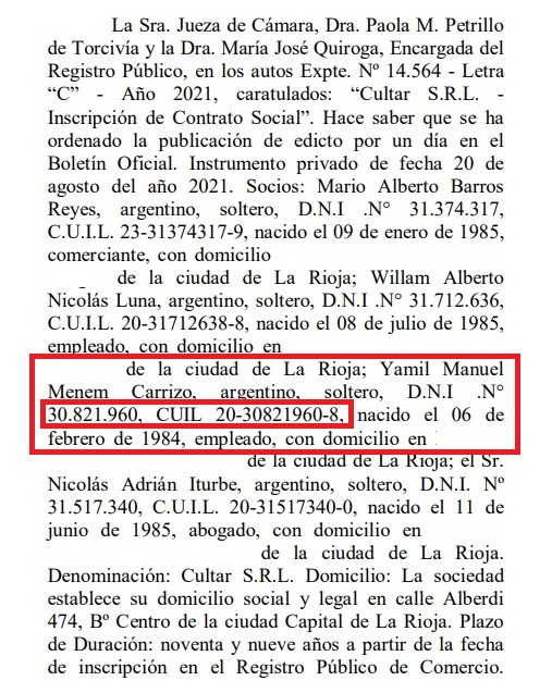 En el Boletín Oficial de La Rioja del viernes 18 de marzo de 2022 se conoció la creación de la empresa Cultar SRL, cuyo socio es Yamil Manuel Menem Carrizo, actual titular de la Agencia de Espacios Públicos y Eventos del gobierno de Ricardo Quintela.