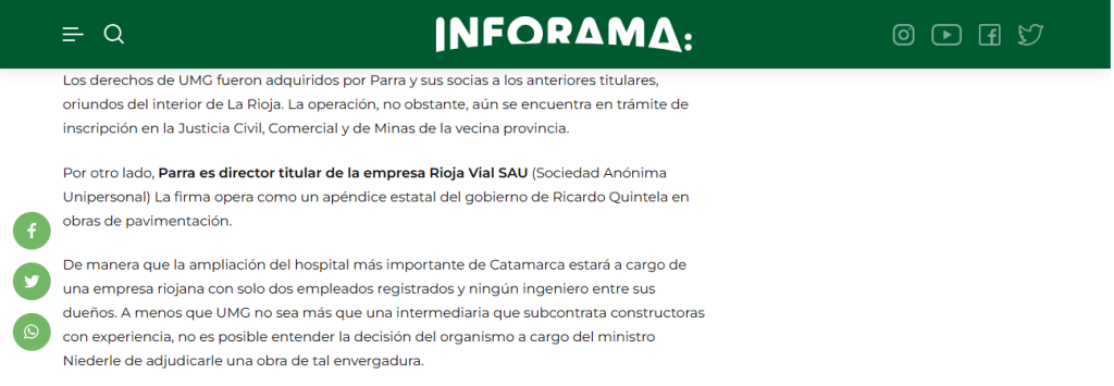 «La falta de transparencia pareciera ser una constante, en la adjudicación de obras por parte del Ministerio de Infraestructura y Obras Civiles de la Provincia, ahora aparece una nueva empresa, UMG COMPAÑÍA MINERA SRL que tan solo en 3 meses le fueron adjudicadas grandes obras por un monto total de 6.600 millones de pesos». Menciona el comunicado compartido por la Cámara de Diputados de Catamarca.