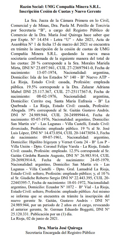 El dueño de UMG Compañía Minera es Lucas Daniel Parra, de 43 años y de profesión abogado. El cual posee el 75% de las acciones de la empresa. Sus socios minoritarios son Mirta Mariela Morales (20%), empleada pública, y Eliana Moyano Vega Aciar (4,5%), de profesión médica. Los tres tienen domicilio en la capital riojana, según El Ancasti de Catamarca.