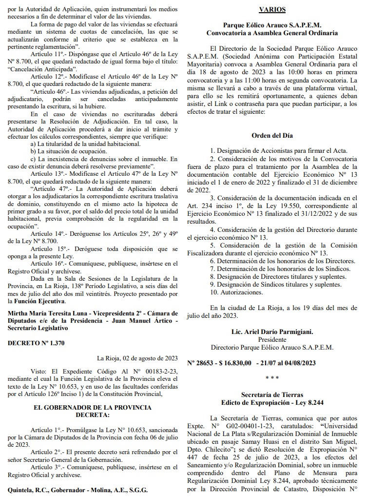 “Artículo 22º.- Ante el incumplimiento de pago de cinco (5) cuotas de amortización consecutivas o alternadas se procederá a intimar por medio fehaciente por el término de treinta (30) días al pago de la deuda, pudiendo ejercer la Autoridad de Aplicación la facultad de perseguir el cobro de lo adeudado por la vía judicial pertinente, remitiendo las actuaciones a Fiscalía de Estado. En tal caso, el informe de