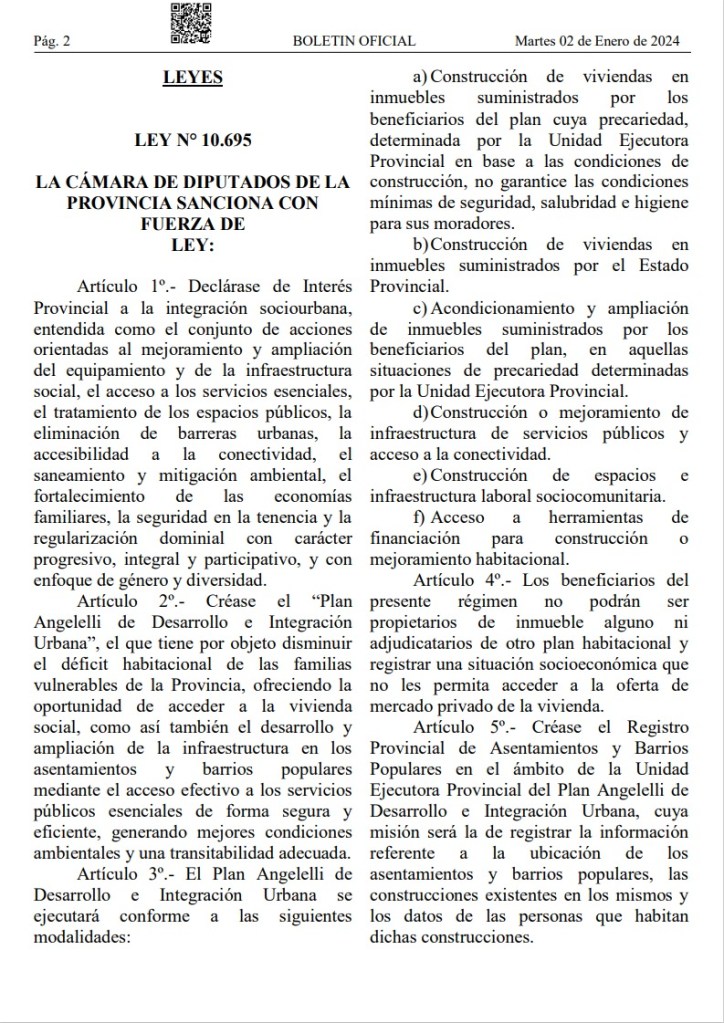 Artículo 2º.- Créase el “Plan Angelelli de Desarrollo e Integración Urbana”, el que tiene por objeto disminuir el déficit habitacional de las familias vulnerables de la Provincia, ofreciendo la oportunidad de acceder a la vivienda social, como así también el desarrollo y ampliación de la infraestructura en los asentamientos y barrios populares mediante el acceso efectivo a los servicios públicos esenciales de forma segura y eficiente, generando mejores condiciones ambientales y una transitabilidad adecuada.
