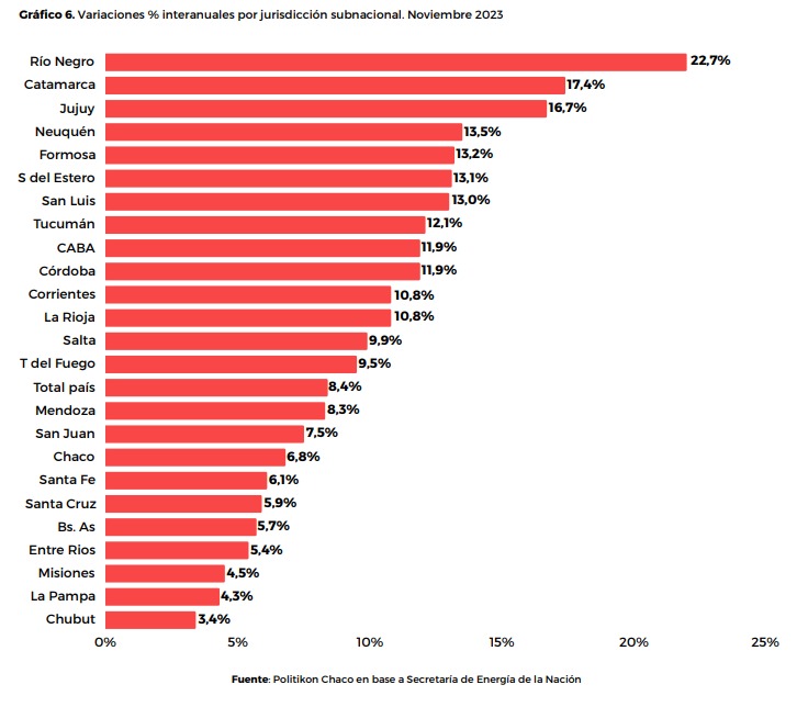 En este marco, Río Negro exhibió la mayor tasa de crecimiento del mes con 22,7% interanual, seguida por Catamarca y Jujuy (17,4% y 16,7%, respectivamente).