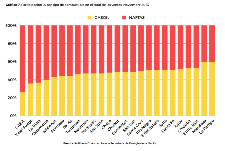 En 15 de las 24 jurisdicciones subnacionales las naftas dominaron las ventas por sobre el gasoil, en términos de volumen, al igual que se observa para el total nacional.