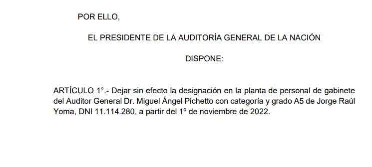 ARTÍCULO 1°.- Dejar sin efecto la designación en la planta de personal de gabinete del Auditor General Dr. Miguel Ángel Pichetto con categoría y grado A5 de Jorge Raúl Yoma, DNI 11.114.280, a partir del 1º de noviembre de 2022.