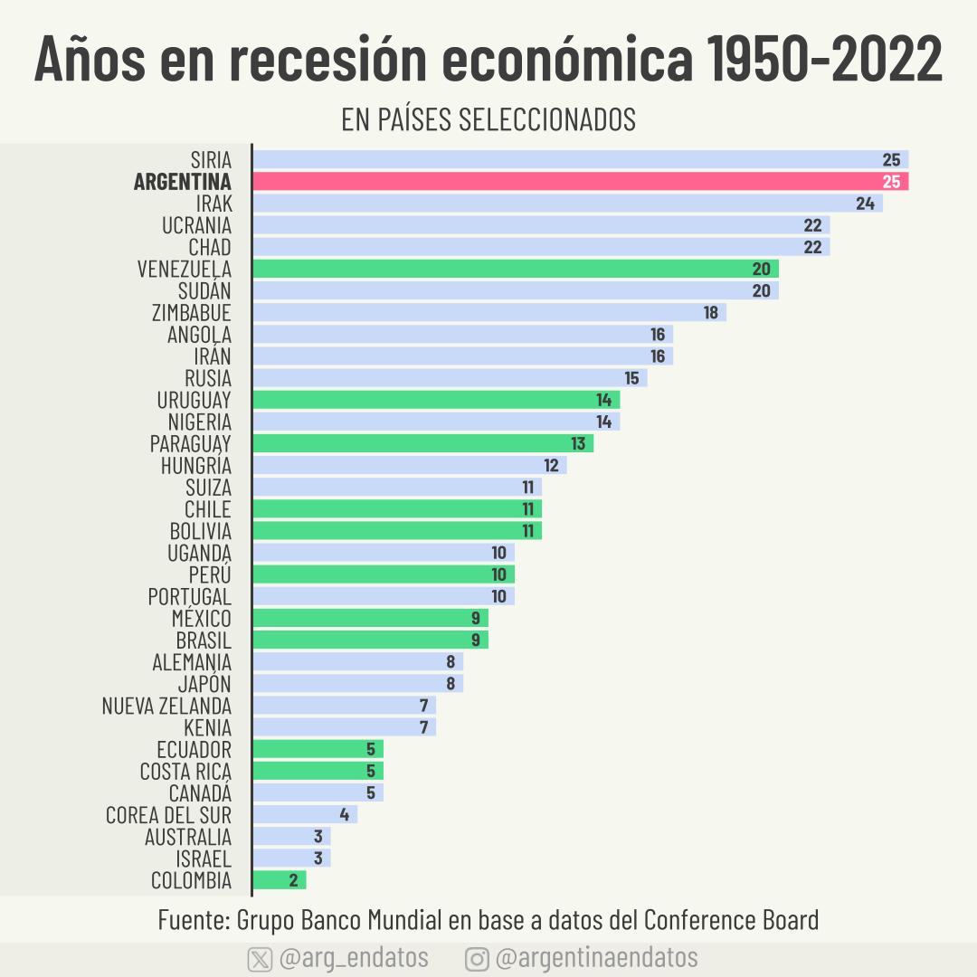 En un reciente informe basado en datos del Grupo Banco Mundial y el Conference Board, se reveló que Argentina ha experimentado 25 años de recesión económica desde 1950, situándose en el primer lugar junto a Siria entre los países seleccionados. Este preocupante indicador coloca a Argentina en la cúspide de una lista que incluye a otras naciones con historiales económicos inestables.