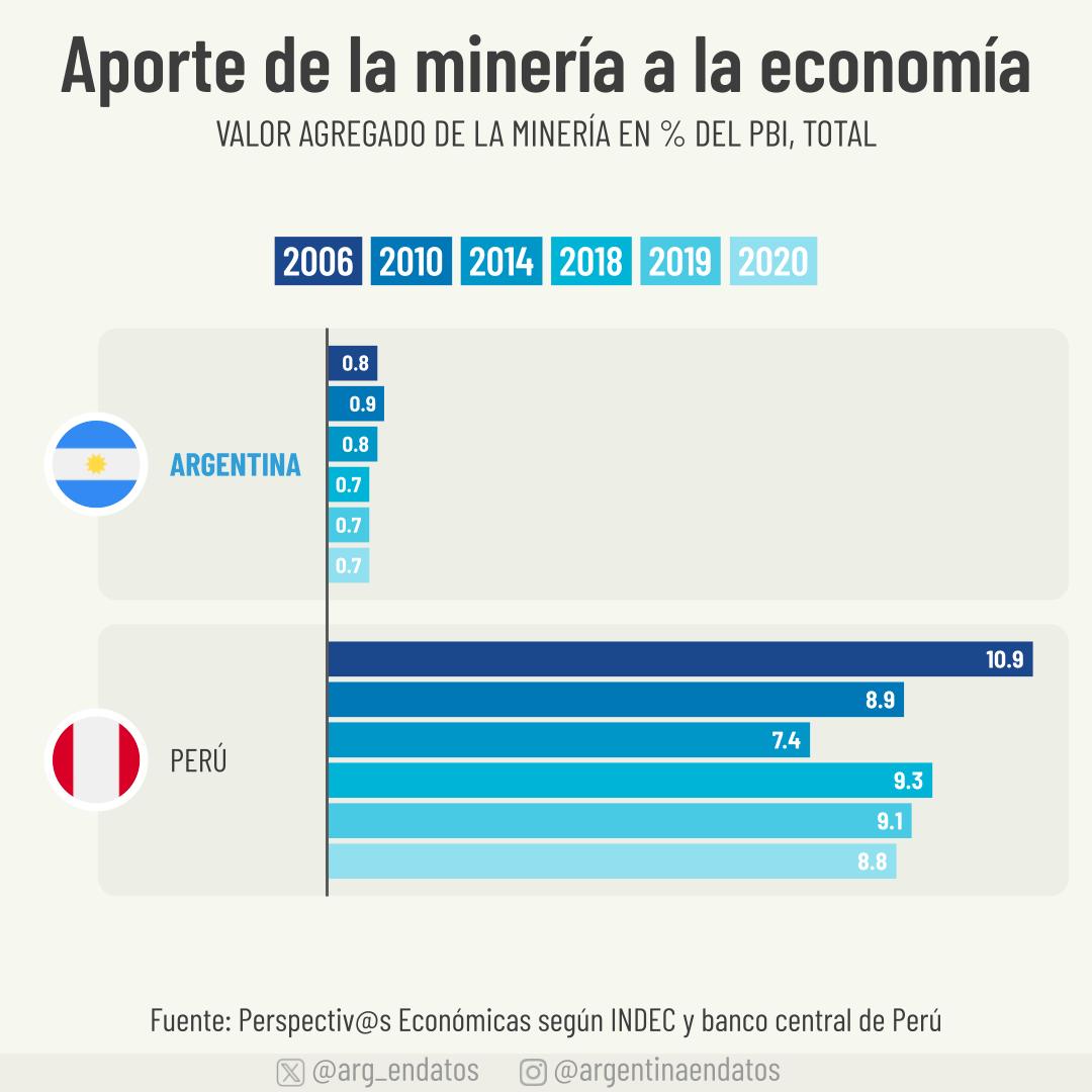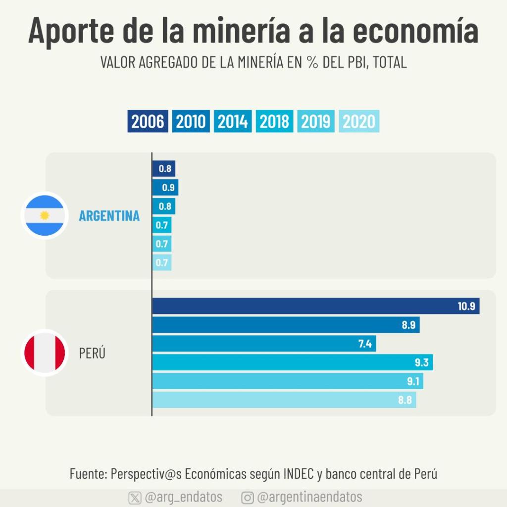 La comparación destaca la diferencia en la importancia relativa de la minería para las economías de Argentina y Perú. Mientras que en Argentina el sector minero mantiene una presencia constante pero limitada en términos de PBI, en Perú representa una parte crucial y más volátil de la economía nacional.