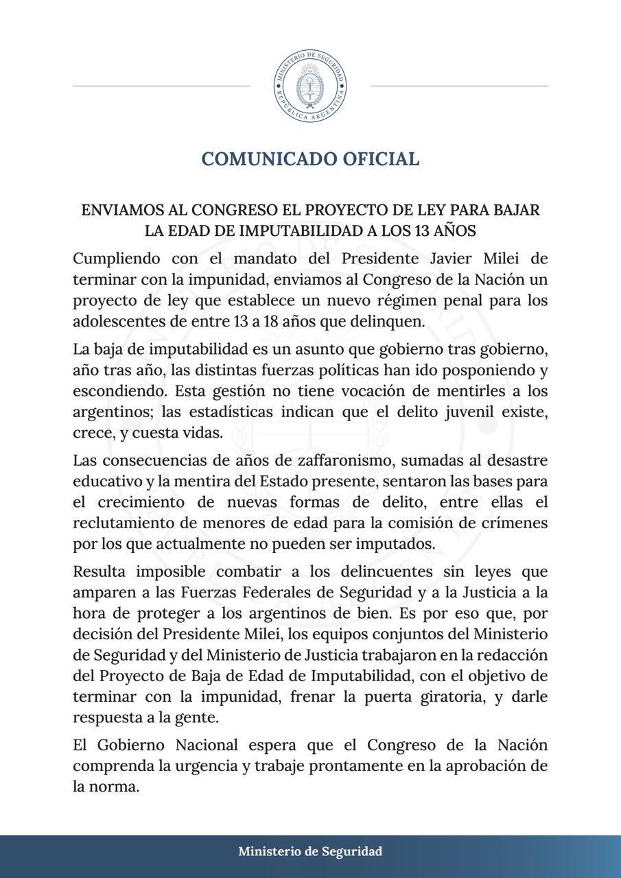El Ministerio de Seguridad de Argentina ha generado un acalorado debate al anunciar el envío de un proyecto de ley al Congreso para reducir la edad de imputabilidad de 16 a 13 años. Esta medida busca enfrentar la impunidad y mejorar la seguridad pública, según lo expresado en un comunicado oficial.