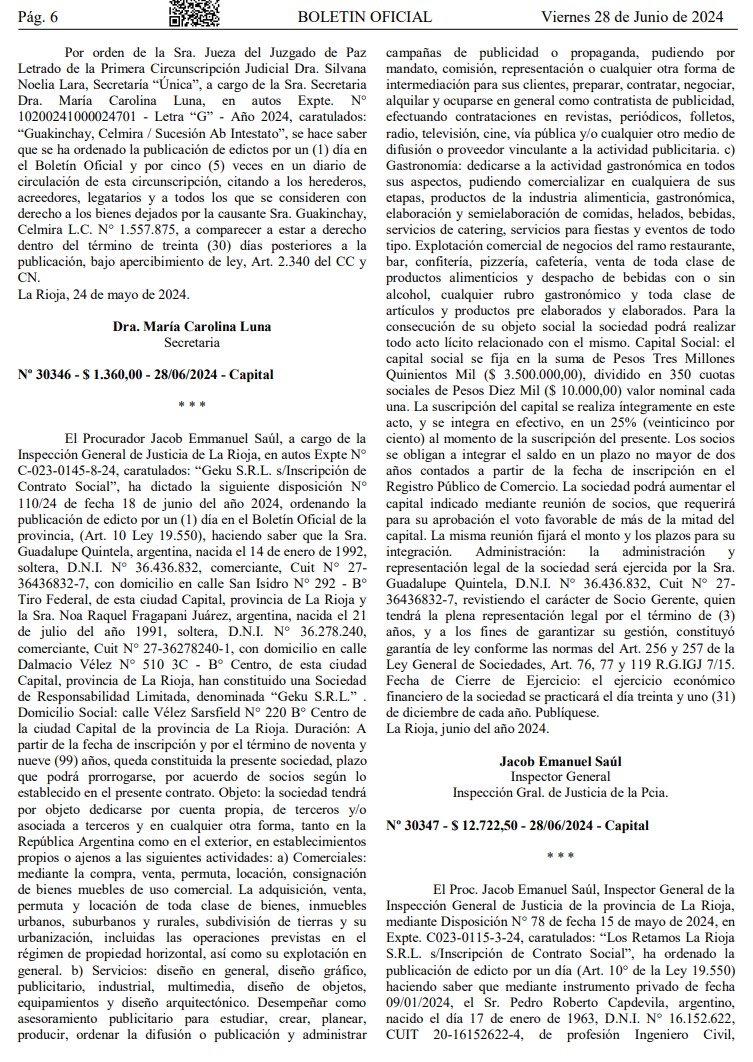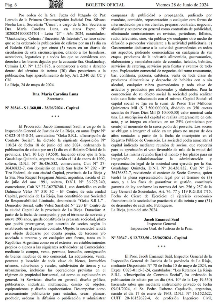 En una reciente disposición, el Procurador Jacob Emmanuel Saúl, a cargo de la Inspección General de Justicia de La Rioja, ha anunciado la inscripción de la nueva Sociedad de Responsabilidad Limitada, «Geku S.R.L.», mediante la Disposición N° 110/24, dictada el 18 de junio de 2024. Este anuncio se realiza en cumplimiento del Artículo 10 de la Ley 19.550, que ordena la publicación del edicto en el Boletín Oficial de la provincia por un día.