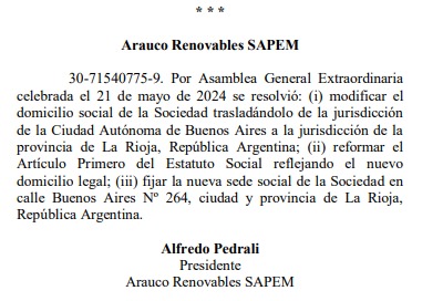 Según se informó, la empresa, presidida por Alfredo Pedrali, modificó el Artículo Primero de su Estatuto Social para reflejar este cambio, estableciendo como nueva sede social la dirección Buenos Aires Nº 264, en la capital riojana. Este movimiento representa un ajuste significativo en la estructura operativa de Arauco Renovables SAPEM, que busca fortalecer su presencia en la región cuyana.