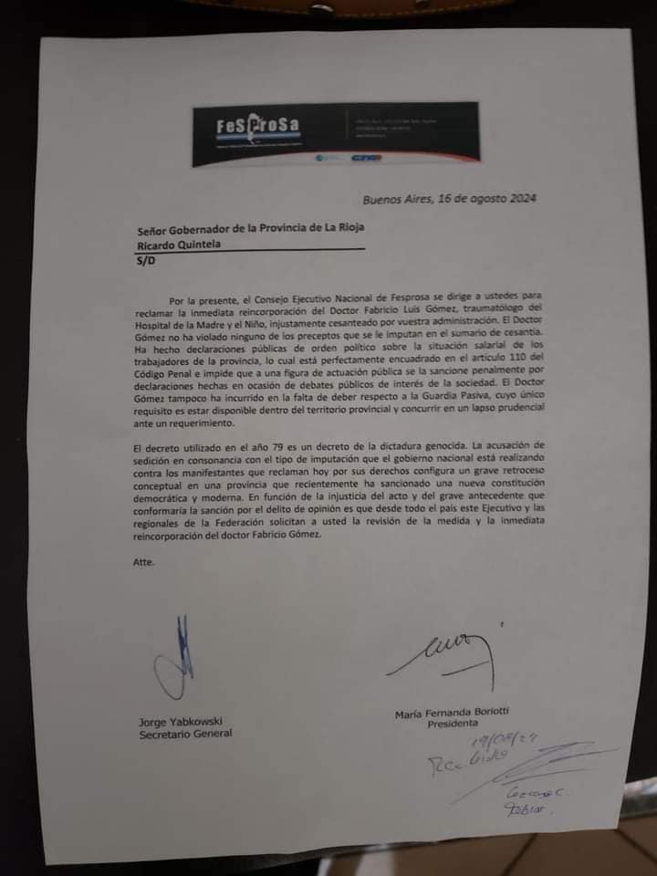 A nivel local, AProSLaR solicitó la intervención de FESPROSA para reclamar por el caso del Dr. Fabricio Gomez, quien fue despedido la semana pasada del Hospital de la Madre y el Niño en La Rioja. En respuesta, el lunes 19 de agosto, FESPROSA entregó una nota formal al Ministro de Salud, Juan Carlos Vergara, y al Gobernador Ricardo Quintela, a través de la Jefatura de Gabinete, solicitando la revisión de la medida y la reincorporación inmediata del Dr. Gomez.