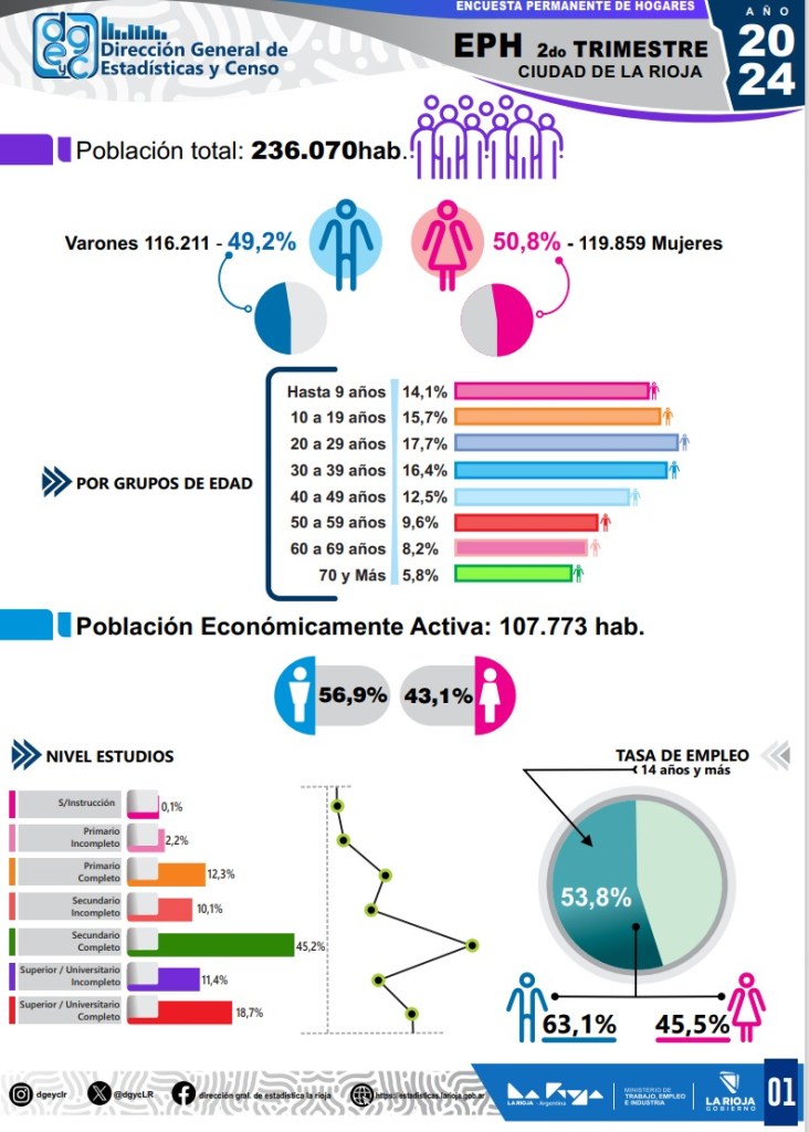 El informe de la Encuesta Permanente de Hogares (EPH) correspondiente al segundo trimestre de 2024 revela que la ciudad de La Rioja registró una tasa de desocupación del 6,5%, lo que representa una leve mejoría en comparación con períodos anteriores. La Población Económicamente Activa (PEA) ascendió a 107.773 habitantes, de los cuales 100.770 se encuentran ocupados, mientras que 7.003 personas permanecen desocupadas.
