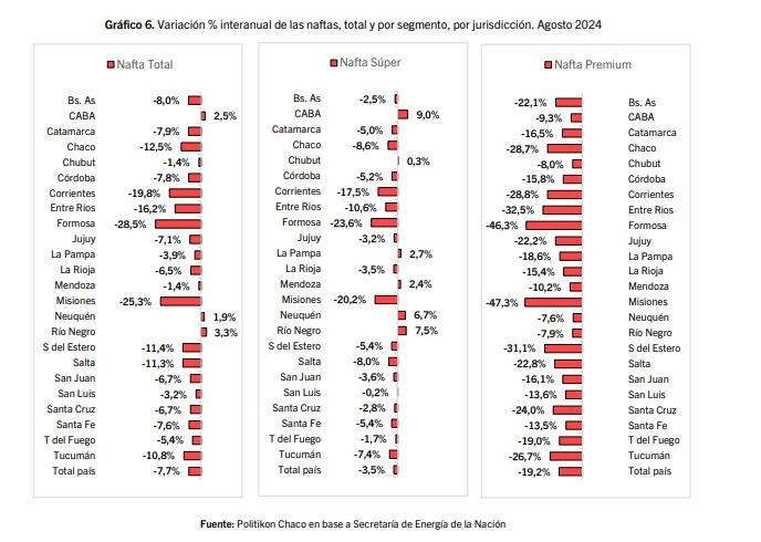 A nivel nacional, solo dos provincias lograron revertir esta tendencia. Río Negro y Chubut mostraron alzas del 3,2% y 1,0% respectivamente, impulsadas por el crecimiento en la venta de gasoil en esas regiones. Por otro lado, provincias como Formosa y Corrientes fueron las más afectadas, con caídas de hasta el 29%.