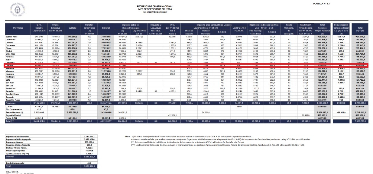 La provincia de La Rioja ha recibido un total de $84.045 millones en concepto de transferencias de recursos de origen nacional durante el mes de septiembre de 2024, según datos oficiales publicados por la Subsecretaría de Coordinación Fiscal Provincial. Esta cifra incluye fondos provenientes de diversos impuestos, como el Impuesto al Valor Agregado (IVA), el Impuesto a los Combustibles Líquidos y Bienes Personales, entre otros.
