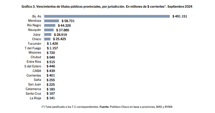 En septiembre de 2024, La Rioja se sumó a las provincias argentinas que enfrentaron vencimientos de títulos públicos, aunque en un monto relativamente bajo comparado con otras jurisdicciones. Según el informe elaborado por Politikon Chaco, la provincia registró un total de vencimientos por $140,6 millones, lo que la posiciona entre las provincias con menor presión financiera en este aspecto.