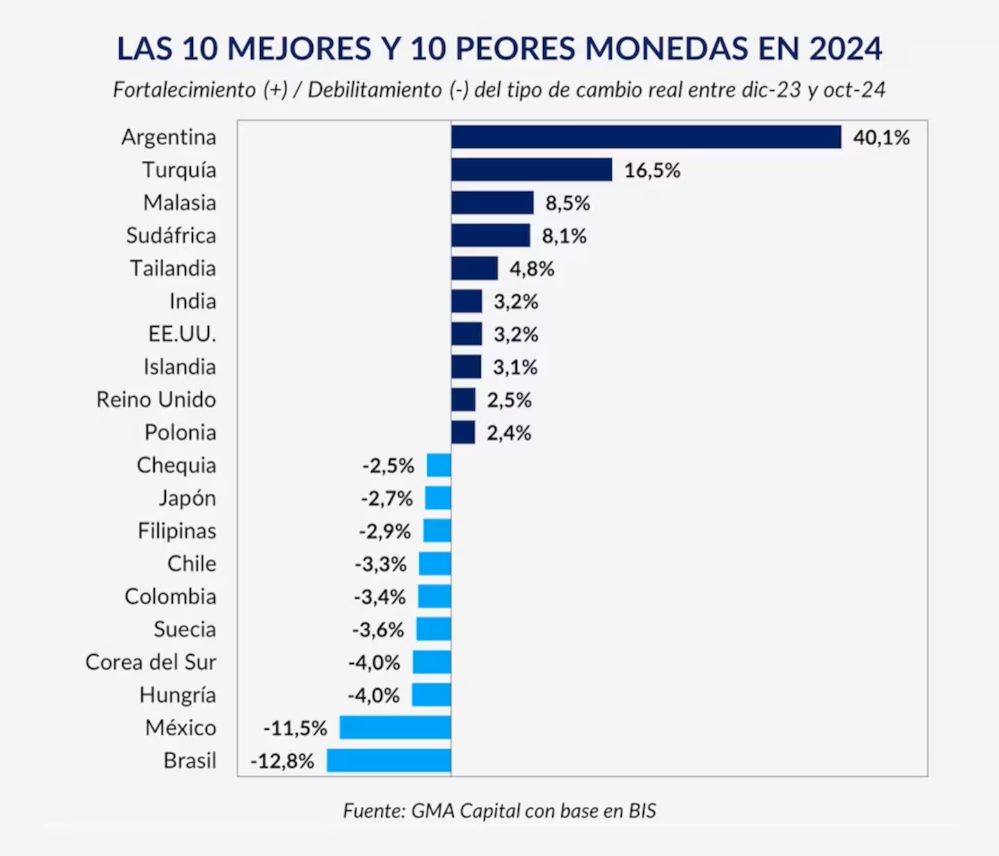 El peso argentino registró en 2024 un fortalecimiento récord frente al dólar, con una revalorización real del 40,1% entre diciembre de 2023 y octubre de este año, según un informe de GMA Capital basado en estimaciones del Bank for International Settlements (BIS). Este desempeño ubicó al peso en el primer lugar del ranking mundial de monedas que más se apreciaron, superando a la lira turca (16,5%) y al ringgit de Malasia (8,5%).