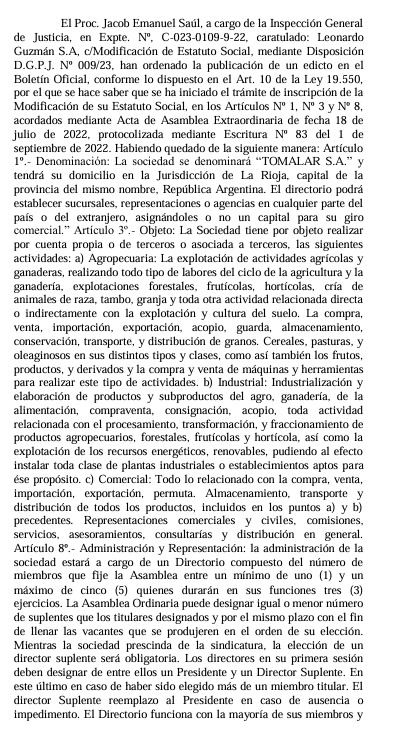 La Inspección General de Justicia de La Rioja, mediante la Disposición D.G.P.J. Nº 009/23, ordenó la publicación de un edicto en el Boletín Oficial relacionado con la modificación del estatuto social de la empresa Leonardo Guzmán S.A., que ahora pasa a denominarse TOMALAR S.A.. La publicación se realizó en el Boletín Oficial de la Provincia, en su edición N.º 12.059, del martes 16 de mayo de 2023.