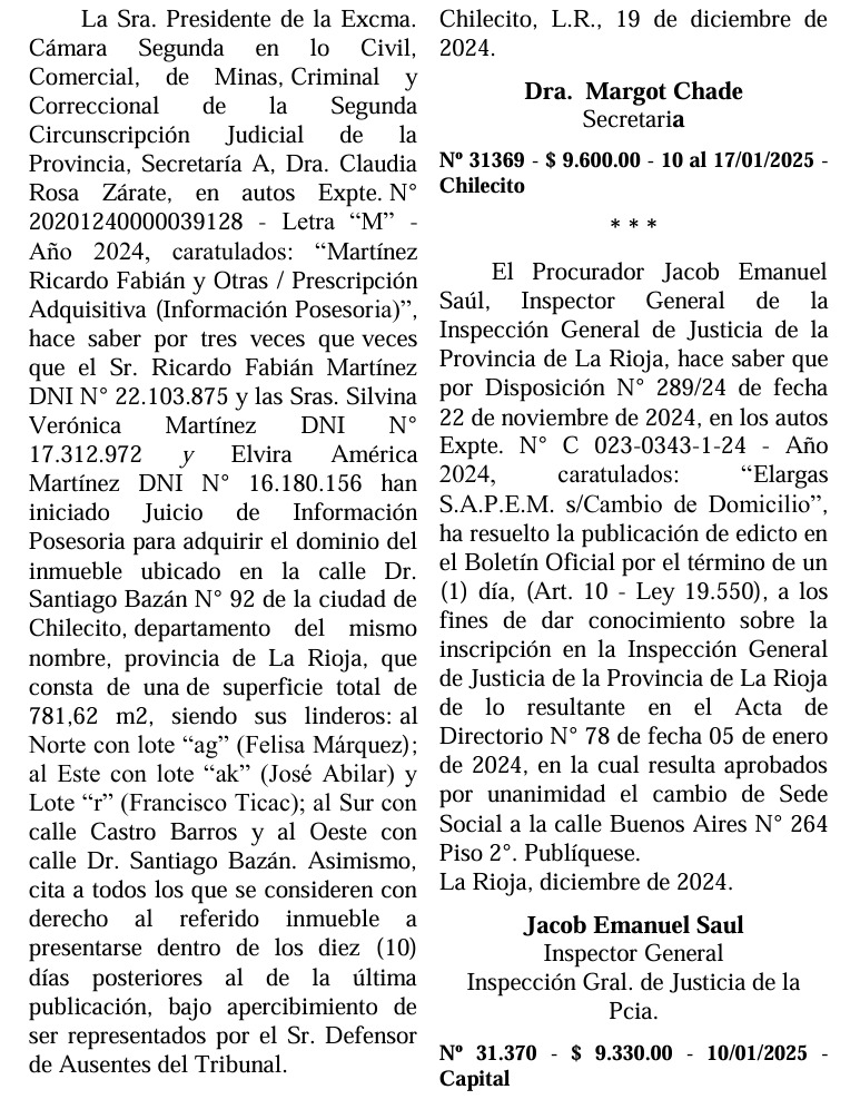 El Procurador Jacob Emanuel Saúl, Inspector General de la Inspección General de Justicia de la Provincia de La Rioja, ha emitido un comunicado en virtud de la Disposición N° 289/24, fechada el 22 de noviembre de 2024. En el expediente N° C 023-0343-1-24, caratulado “Elargas S.A.P.E.M. s/Cambio de Domicilio”, se ha resuelto la publicación de un edicto en el Boletín Oficial por un término de un (1) día, según lo establecido en el Artículo 10 de la Ley 19.550.
