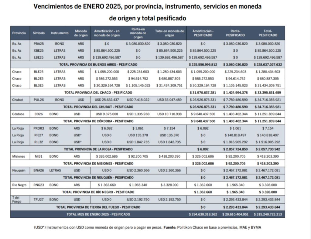 En enero de 2025, La Rioja se encuentra ante vencimientos de títulos públicos que suman aproximadamente $2.058 millones, de los cuales $6 millones corresponden a bonos en pesos y el resto a instrumentos en dólares. Este monto representa una fracción muy pequeña del total nacional de $315.241 millones, lo que demuestra la limitada participación de la provincia en el mercado de títulos provinciales.