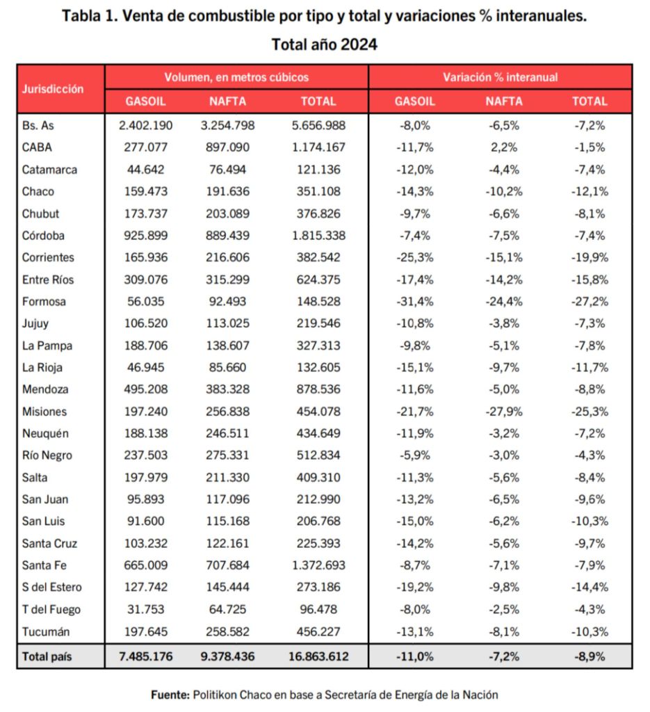 A nivel nacional, las ventas totales de combustibles ascendieron a 1.495.855 metros cúbicos, con una ligera recuperación del 1,6% respecto a noviembre. Sin embargo, La Rioja se encuentra entre las provincias que continúan con cifras negativas, reflejando la difícil situación económica del sector. El gasoil, que representó cerca del 35% de las ventas en la provincia, mostró una caída del 9,2% en su segmento, mientras que la nafta tuvo una disminución del 2,7%.