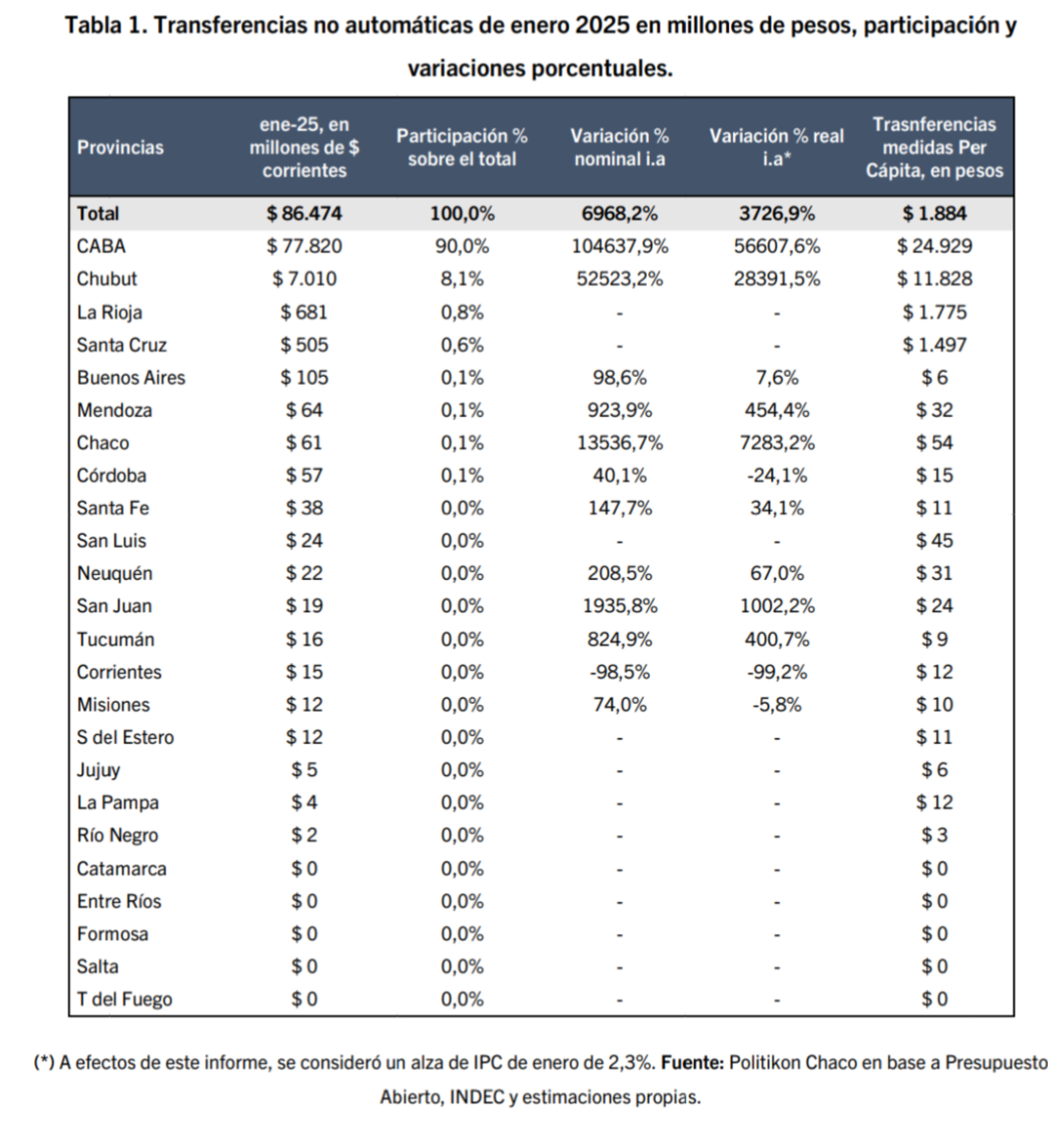 A nivel nacional, las transferencias no automáticas alcanzaron un total de $86.474 millones, con un aumento del 3.726,9% en términos reales respecto al mismo mes del año anterior. Sin embargo, esta cifra está distorsionada por el drástico recorte del 98% en los envíos del año anterior, lo que convierte a enero de 2025 en el tercer peor enero de los últimos 20 años, solo superado por 2010 y 2024.