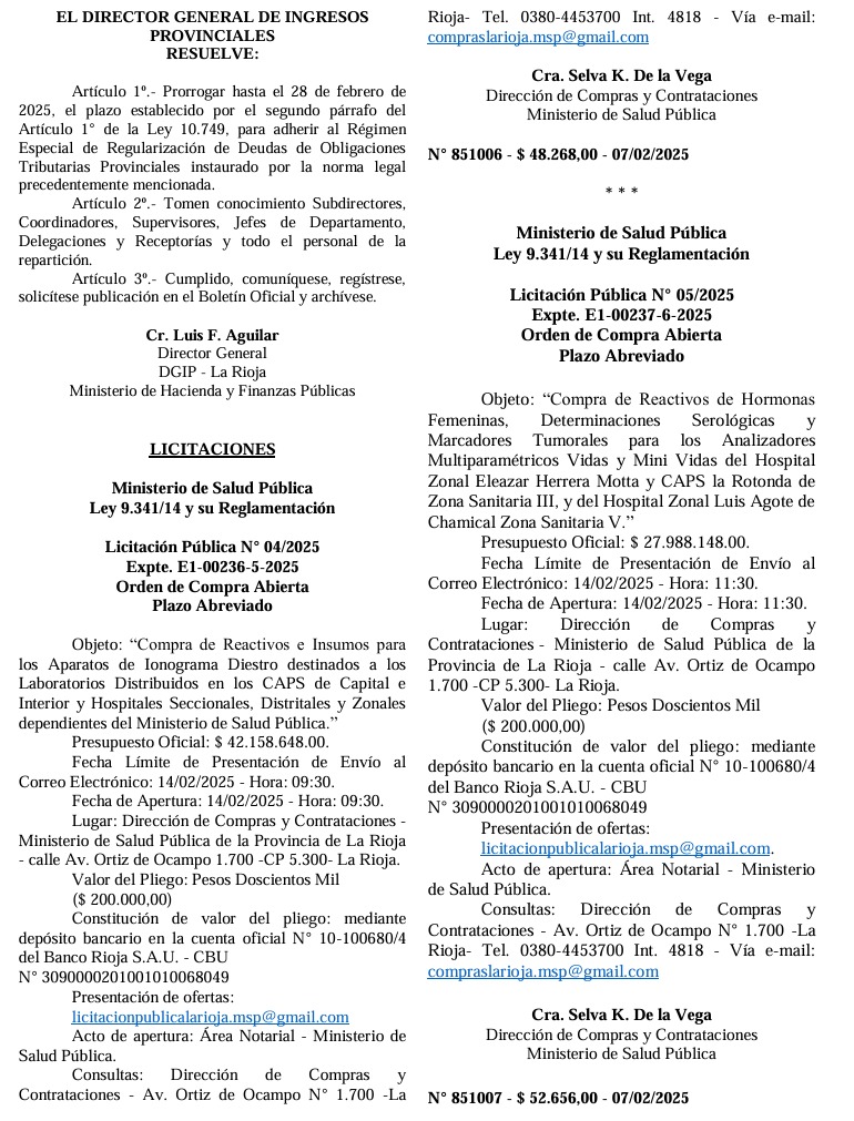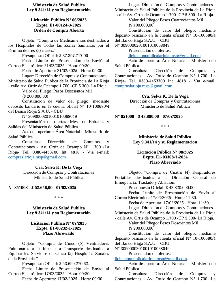 Además, la Licitación Pública N° 06/2025 contempla la compra de medicamentos para hospitales de todas las zonas sanitarias, con un presupuesto de $37.397.717,00 y la fecha de apertura fijada para el 21 de febrero de 2025.