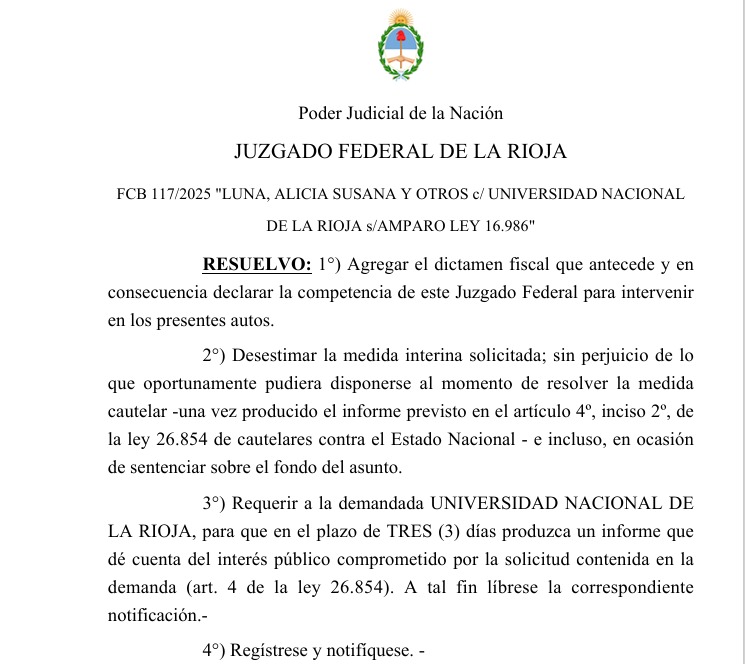 En una reciente resolución, el Juzgado Federal de La Rioja desestimó la medida cautelar solicitada por un grupo de nodocentes de la Universidad Nacional de La Rioja (UNLaR), quienes promovieron una acción de amparo tras la revocación de sus nombramientos en planta permanente. Los actores, representados por la Asociación de Trabajadores Universitarios Riojanos (ATUR), argumentaron que las resoluciones rectorales que afectaron sus puestos son ilegítimas y arbitrarias.