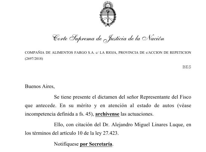 La Corte Suprema de Justicia de la Nación ha decidido archivar las actuaciones en el expediente CSJ 2697/2018, donde la Compañía de Alimentos Fargo S.A. había interpuesto una acción de repetición contra la Provincia de La Rioja. Esta decisión se basa en el dictamen del señor Representante del Fisco y en la incompetencia definida en el expediente.