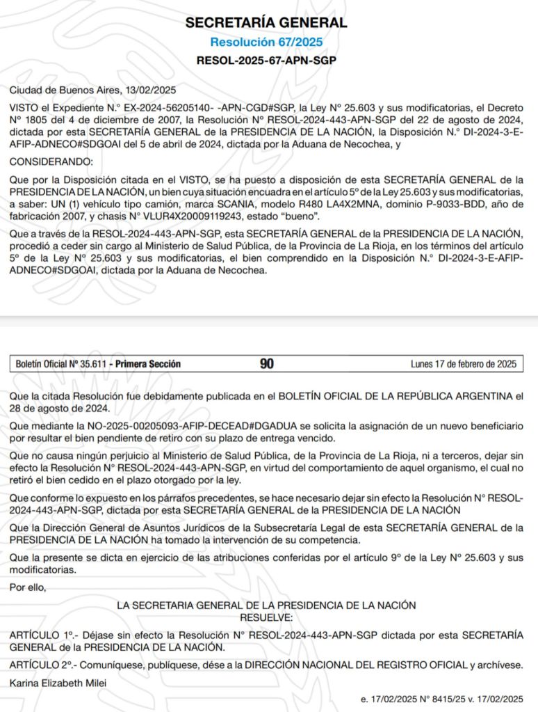 En una reciente medida, la Secretaría General de la Presidencia de la Nación ha emitido la Resolución 67/2025, que deja sin efecto la cesión de un camión SCANIA al Ministerio de Salud Pública de la Provincia de La Rioja. Esta decisión surge tras la constatación de que el ministerio no retiró el vehículo dentro del plazo establecido por la ley, lo que motivó la solicitud de un nuevo beneficiario.