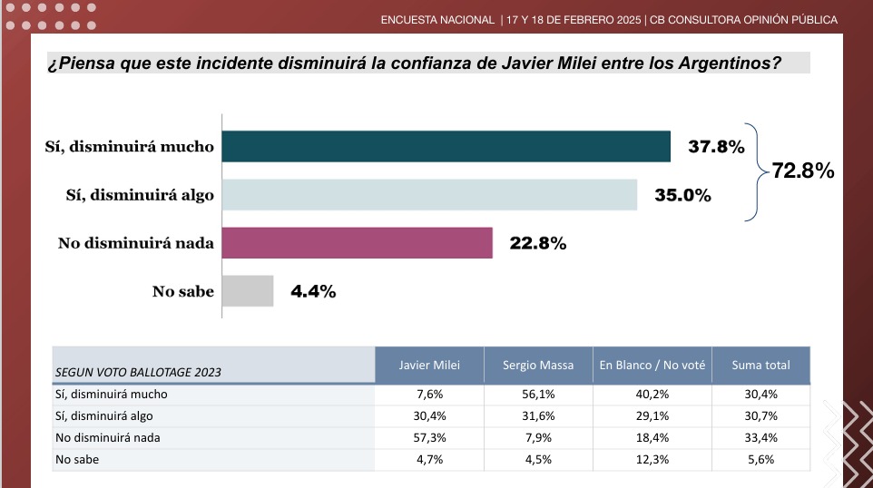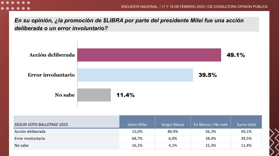 Es la respuesta a la pregunta: ¿La promoción de $LIBRA por parte del presidente Milei fue una acción deliberada o un error involuntario?, según datos de CB consultora