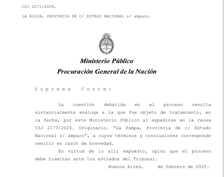 En un escrito puntualizó que «La cuestión debatida en el proceso resulta sustancialmente análoga a la que fue objeto de tratamiento, en la fecha, por este Ministerio Público al expedirse en la causa CSJ 2173/2024. Originario. “La Pampa, Provincia de c/ Estado Nacional s/ amparo”, a cuyos términos y conclusiones corresponde remitir en razón de brevedad. En virtud de lo allí expuesto, opino que el proceso debe tramitar ante los estrados del Tribunal».