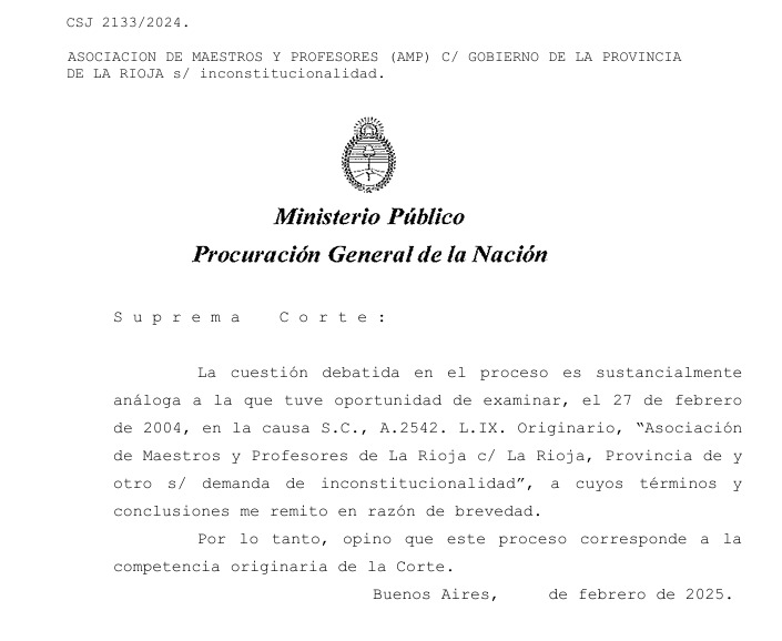 La cuestión debatida en el proceso es sustancialmente análoga a la que tuve oportunidad de examinar, el 27 de febrero de 2004, en la causa S.C., A.2542. L.IX. Originario, “Asociación de Maestros y Profesores de La Rioja c/ La Rioja, Provincia de y otro s/ demanda de inconstitucionalidad”, a cuyos términos y conclusiones me remito en razón de brevedad. Por lo tanto, opino que este proceso corresponde a la competencia originaria de la Corte.