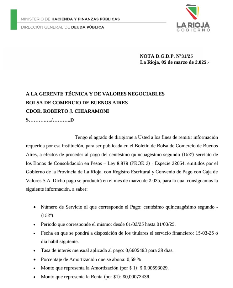 En una reciente comunicación, la Dirección General de Deuda Pública de La Rioja ha confirmado que el pago del centésimo quincuagésimo segundo servicio de los Bonos de Consolidación en Pesos, emitidos por el Gobierno de la Provincia, se llevará a cabo entre el 1 y el 3 de marzo de 2025. Los interesados podrán realizar el cobro en la Caja de Valores S.A., ubicada en 25 de Mayo 362, Capital Federal, en un horario de 10 a 15 horas.
